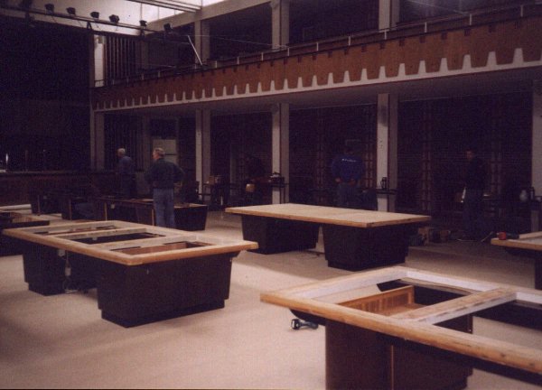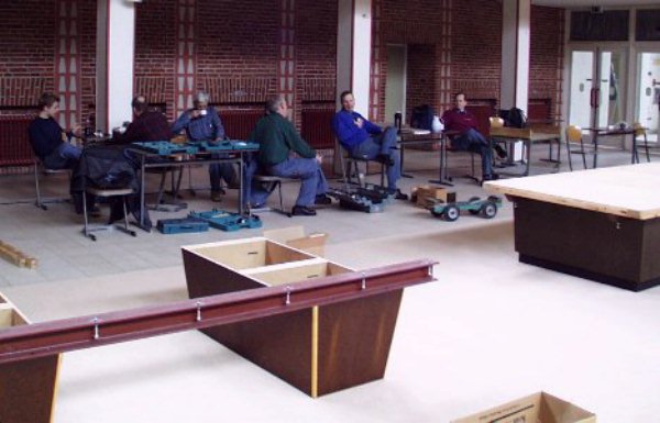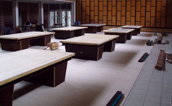 Anklicken zum Vergrößern - click to zoom Der Aufbau geht sehr schnell voran, die dänische Truppe kann sich bald die erste Pause leisten (l.u.). Kurz danach liegen alle Platten und werden exakt ausgerichtet (m.u.). Während alle anderen arbeiten, wird Holger Schlüter von Turnierchef Gunther Mylius in die Verbandspolitik des NBV und der DBU eingewiesen (r.o.). Anklicken zum Vergrößern - click to zoom