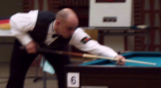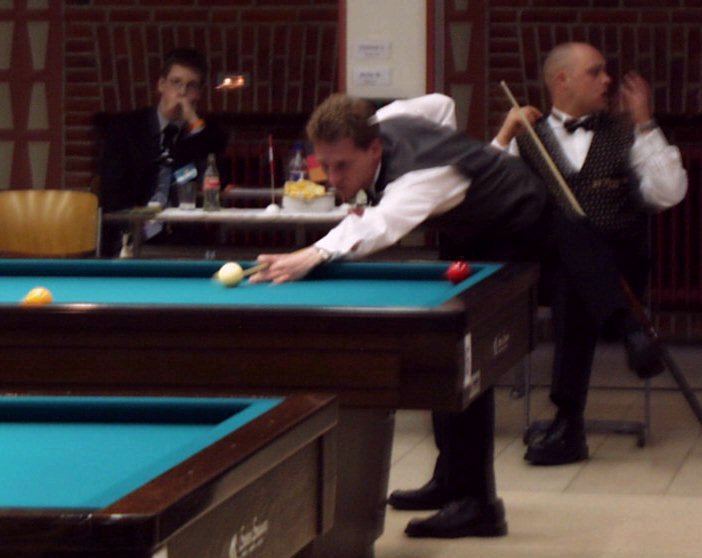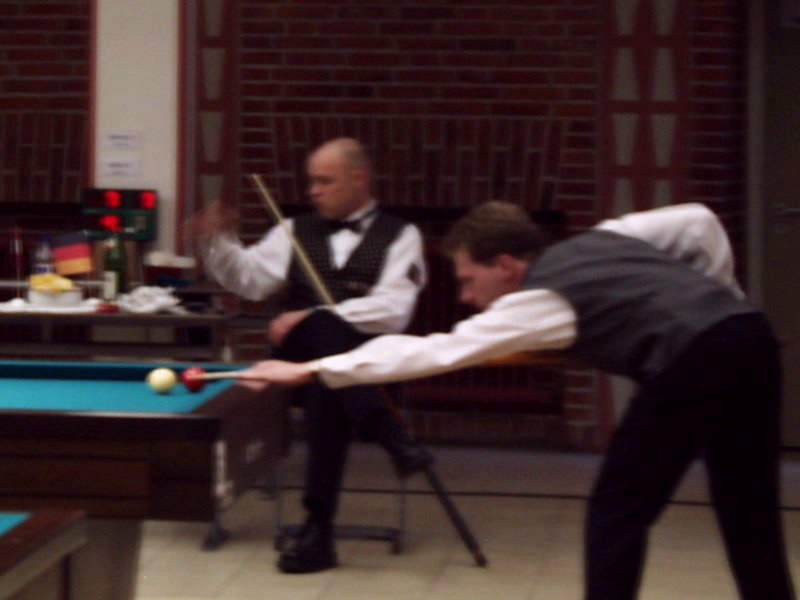 Anklicken zum Vergrößern - click to zoom In der Haupttrunde der letzten 32 kam es zu vielen spannenden Partie. Zunächst setzte J. Schirmbrand (li.o.) mit 1.764 gegen den Lokalmatadoren E.Schoen eine neue Bestmarke. J.Eggers (re.o.) gewann mühevoll mit 2:1 gegen L.Hild (Oberursel). Unten drei Bilder der Begegnung zwischen Jan Osterloh und dem österreichischen Meister Manfred Müller, in der Osterloh nach Gewinn des ersten Satzes im 2. schon wie der Sieger aussah. Aber Müller kämpfte sich zurück in die Partie und konnte ins Achtelfinale einziehen. Anklicken zum Vergrößern - click to zoom