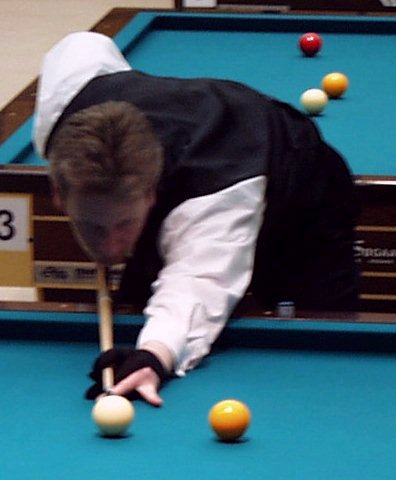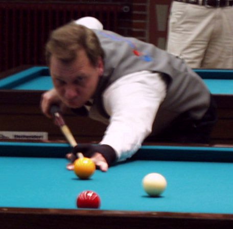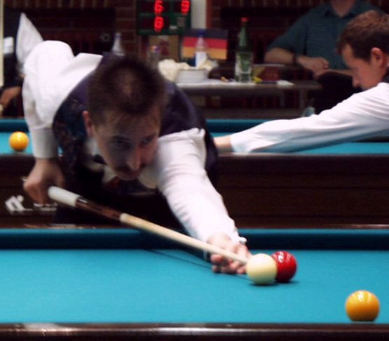 Anklicken zum Vergrößern - click to zoom Im Achtelfinale zog das Niveau des Turniers deutlich an, 5 Partien wurden mit über 1 GD gewonnen. Frank Eversmann (BSV Velbert, li.o.) liess Thomas Ahrens (BSV Hannover, li.u.) beim 2:0 keine Chance. M.Hempel (re.o., BC Wedel) unterlag Martin Ulbig (Berlin) nach einer zähen Kampfpartie knapp mit 1:2. Arno Figge (re.u.) konnte sich genau wie Schirmbrand, Eggers und Witt jeweils mit 2:0 und GD über 1 souverän durchsetzen. Keld Sogaard blieb nach einem 15:6 in 8 Aufnahmen im 3. Satz gegen M.Müller als letzter Ausländer im Turnier. Anklicken zum Vergrößern - click to zoom