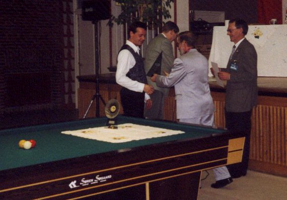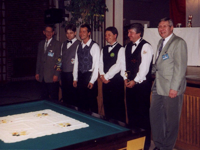 Anklicken zum Vergrößern - click to zoom Li.o. Übergabe des Pokals durch Uwe Schwab an den dritten, Arno Figge (Barmer BF), re.o. an den zweiten, Johann Schirmbrand (Feldmark Gelsenkirchen), der alle Turnierbestmarken (GD 1.165, BED 2.570, HS 12, BES 5.000) aufstellte.Dann bekam Jens Eggers seinen Pokal (li.u.) und durfte eine kurze Rede halten. (Was ihm für eine Premiere sehr gut gelang !). Re.u. : Abschlußfoto eines gelungenen Turniers ! Anklicken zum Vergrößern - click to zoom